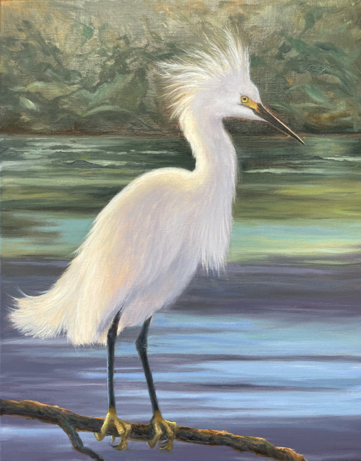 Crowned by the Wind - Snowy Egret - 20" x 16" - Oil on Linen - $4,500.
